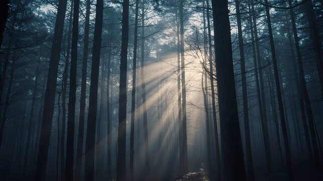 Mysterious dark forest landscape with tall trees and rays of sunlight breaking through foggy mist, perfect for fantasy, horror, mystery, nature, and atmospheric background themes