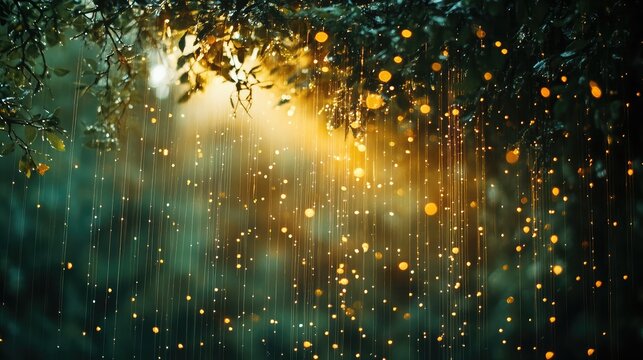 View of rain falling in a forest with sunlight shining through the trees and creating bokeh effect