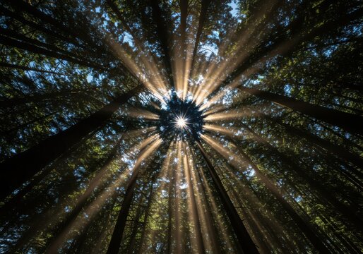 Sunbeams streaming through the dense canopy of a forest, creating a dramatic starburst effect and illuminating the woodland floor