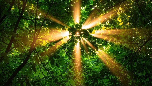 Sunlight streams through the canopy of green leaves in a lush forest, creating a starburst effect, illuminating the vibrant foliage