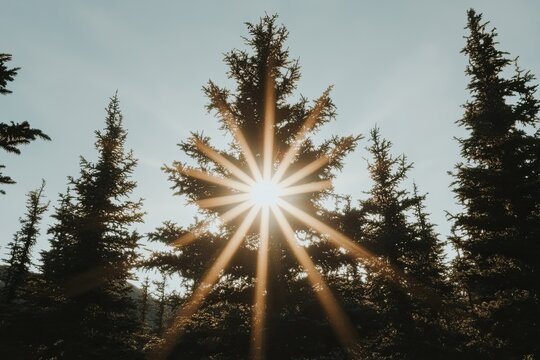 Sunlight piercing through a pine forest canopy.  Golden rays radiate from the sun, creating a starburst effect amidst dark silhouettes of evergreens.  Early morning or late afternoon light