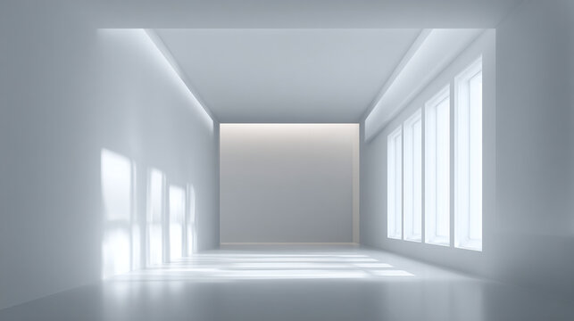 A minimalist empty room with natural light coming through the windows, creating a sense of serenity. The clean lines and bright space offer a sense of calm