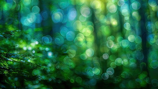 Blurred forest with light filtering through, creating a dreamy, bokeh-filled, vibrant scene