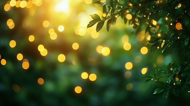Dreamy bokeh effect created by sunlight filtering through leaves, highlighting warm golden tones and a serene natural ambiance.