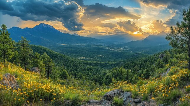 Majestic Mountain Vista at Sunset with Golden Light Filtering Through Dramatic Clouds Over Lush Green Valley