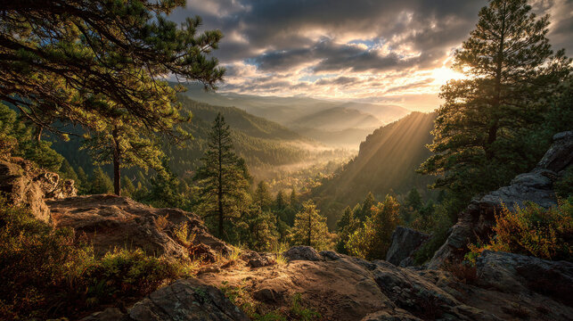 Golden sunlight filtering through clouds over a misty valley filled with lush trees and rugged rock formations during sunrise in a beautiful landscape setting.
