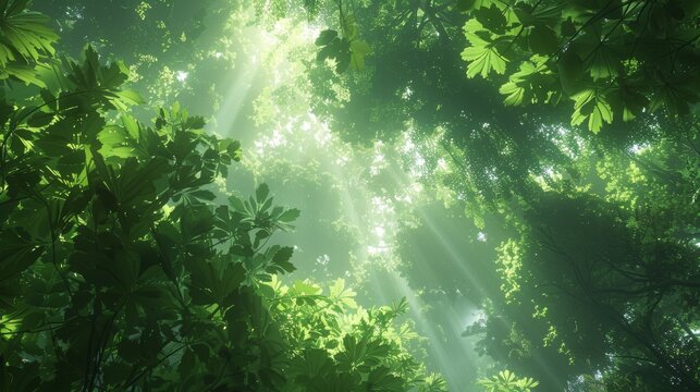 Serene forest canopy with sun rays filtering through trees
