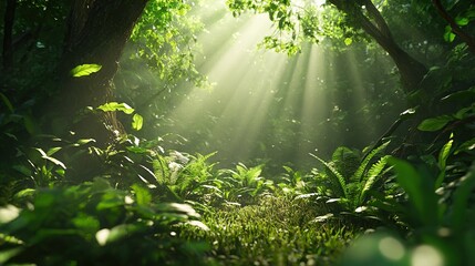 Sunlight filters through dense forest foliage, illuminating lush green plants and creating a serene, vibrant natural scene.