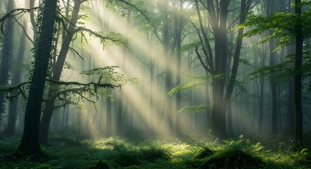 Sunlight filtering through dense forest, illuminating lush green undergrowth
