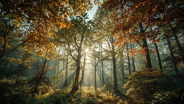 Sunlight filtering through tree canopy in serene forest