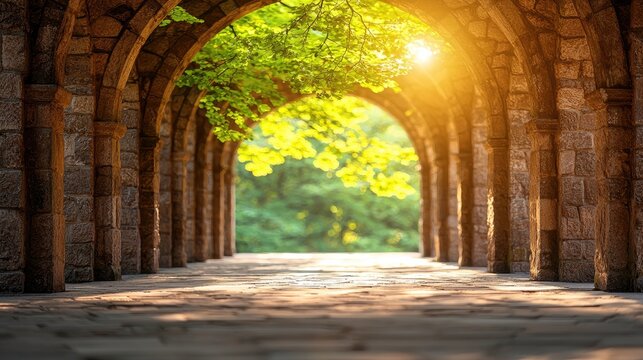 Ancient stone archway bathed in warm golden sunlight filtering through lush green leaves creating a pathway to a mysterious forest