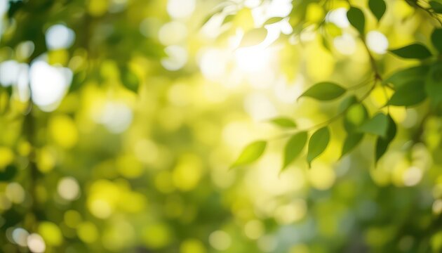 Abstract blurred green foliage with sunlight filtering through the canopy providing a fresh, serene, and natural backdrop