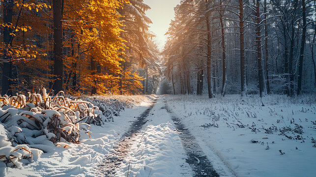 Golden hour sunlight illuminating a snow covered path leading through a winter forest with a dusting of snow