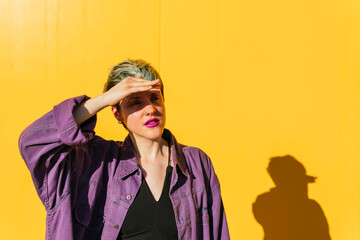 Woman shielding eyes from sunlight in front of yellow wall