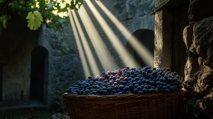 Sunlight streams over a rustic basket overflowing with dark grapes.