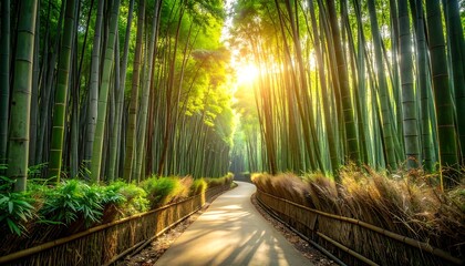 A winding path through a dense bamboo forest, sunlight streaming through the tall green stalks, illuminating the way