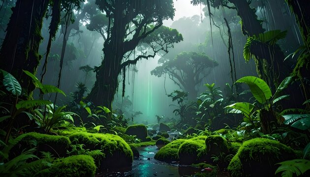 Lush green tropical rainforest canopy with sunlight streaming through dense foliage creates a vibrant and enchanting natural environment for exploration and discovery.
