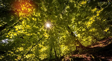 Sunlight streaming through dense forest canopy with green foliage. Natural woodland environment for forest conservation and environmental protection campaigns