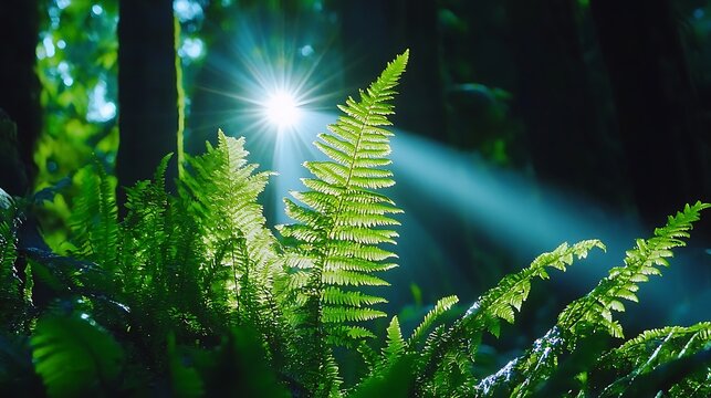 Lush green ferns illuminated by sunlight streaming through a dense forest canopy