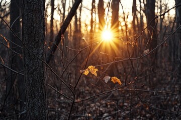 A serene scene with sunlight streaming through a dense forest, highlighting the intricate patterns of tree branches and leaves