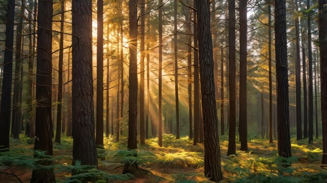 Sunlight streaming through pine forest onto mist-filled valley at dawn with golden rays
