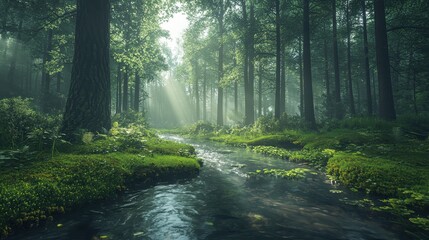 A tranquil forest glade with sunlight filtering softly through the tall trees, illuminating the moss-covered floor. A gentle stream winds its way through the scene, creating a calming atmosphere.