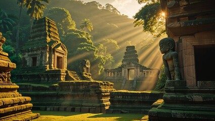 Breathtaking sunbeams streaming through lush vibrant jungle canopy creating a serene and peaceful atmosphere perfect for adventure and exploration concepts