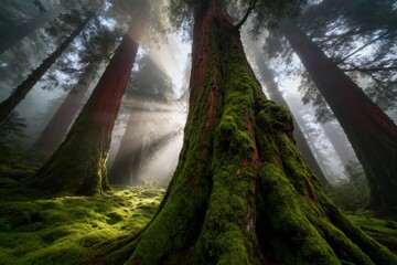 Moss-covered redwood trees in a misty forest with sunlight streaming through the canopy