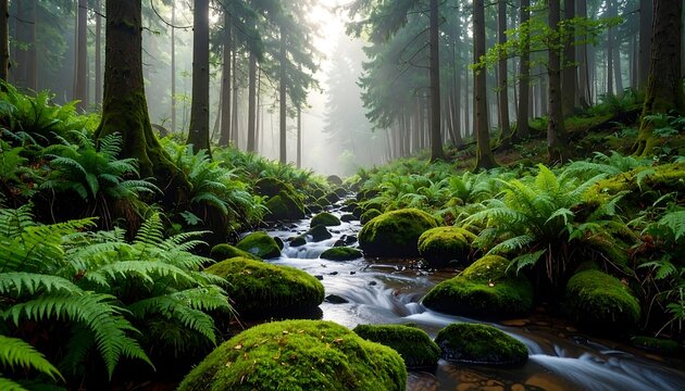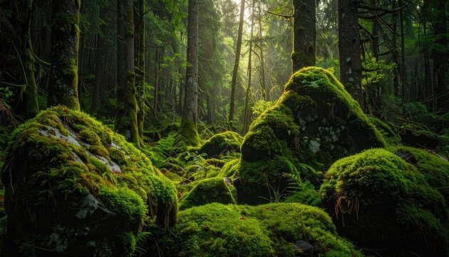 Enchanted Forest: Sunlight Streaming Through Lush Green Mossy Rocks and Towering Trees - Pacific Northwest Landscape