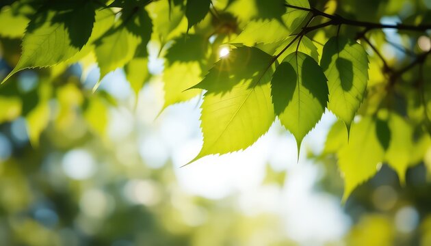 Sunlight filters through green leaves on a tree branch creating a warm natural scene ideal for nature and tranquility themes