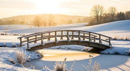 Wooden bridge over frozen stream in a sunlit winter landscape