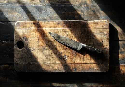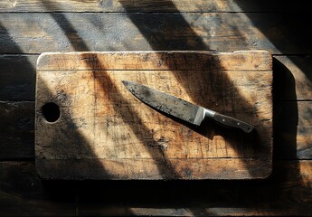 Rustic wooden cutting board with chef's knife on sunlit surface