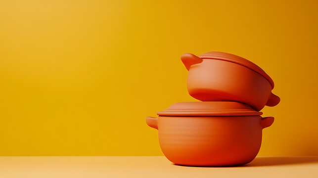 A vibrant image showcasing two nested terracotta cooking pots against a sunny yellow backdrop, blending utility with a touch of warmth and minimalist aesthetics. Perfect for kitchen and cooking