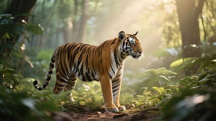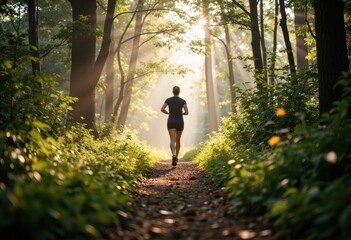 Silhouetted figures walk along a sunlit forest path, surrounded by lush greenery and tropical plants, illustrating exploration and natural beauty.