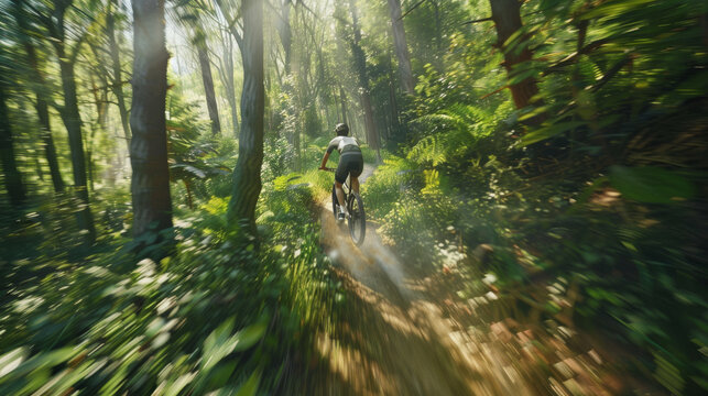 A mountain biker speeds through a sunlit forest trail, surrounded by lush greenery and beams of light breaking through the canopy in an exhilarating ride.