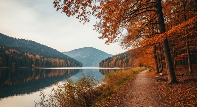 A serene autumnal landscape with a path leading to a tranquil lake, surrounded by trees with vibrant autumn foliage.