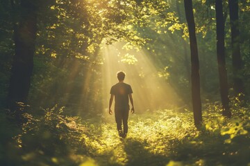 A person walks through a sunlit forest, surrounded by trees and shafts of light piercing through the foliage, creating a tranquil and enchanting atmosphere