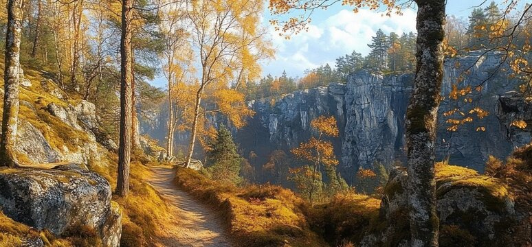 Enchanted pathway of golden trees in forest park