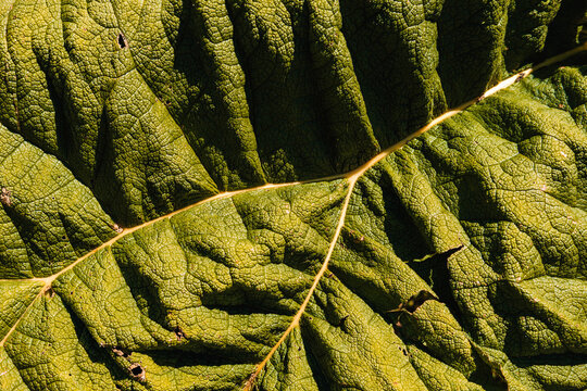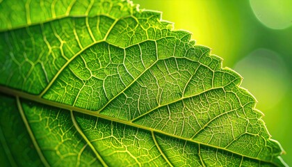 Close up of a vibrant green leaf with intricate vein patterns illuminated by bright sunlight showcasing natural textures and organic detail in macro photography