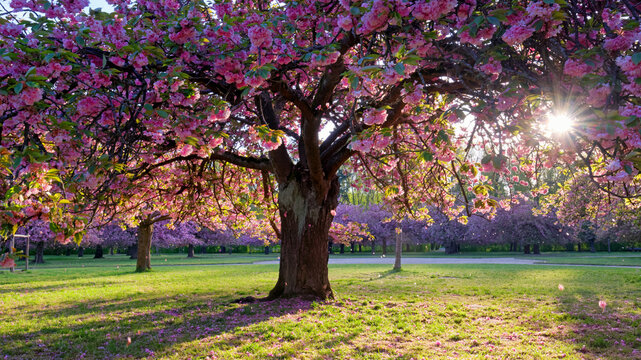 Sunrise and Japanese cherry blossom in the North grove of the Sceaux park.  Ile-De-France region
