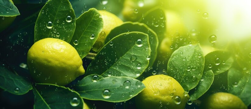 Close up shot of fresh, bright green with yellowish lemon (or lime) on the branch of tree in the organic rural garden in the northern Thailand. Fruit is ripe and ready to harvest for selling