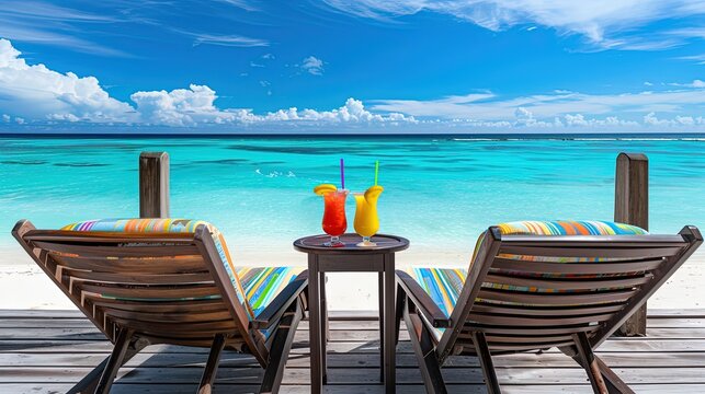 lounge chairs and table With colorful drinks at a beach resort, looking out into the ocean, at noon on a clear, sunny day, Generative Ai