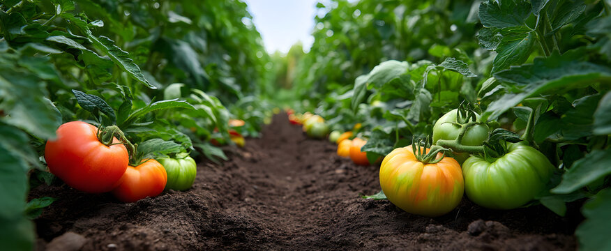 Rows of vibrant and lush colorful vegetables ripening in a warm sunny garden patch