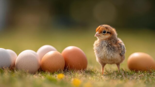 A fluffy baby chick standing beside a cluster of brown and white eggs on a grassy field. Concept Baby chick, Brown and white eggs, Grassy field, Farm life, Springtime
