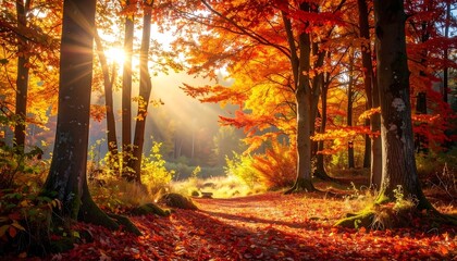 Vibrant autumn forest pathway with sunlit trees
