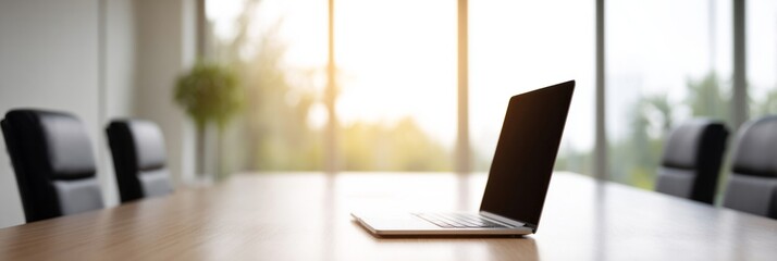 Laptop basks on sunlit boardroom table, echoing silence of Golden Week reflections and eccentric minimalism in modern workspace serenity