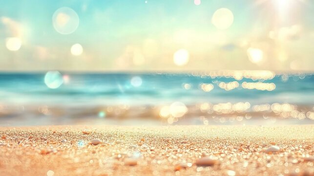Tranquil abstract beach scene with soft bokeh reflections on a calm sea and sky highlighting the sunlit sand in the foreground for a serene coastal ambiance