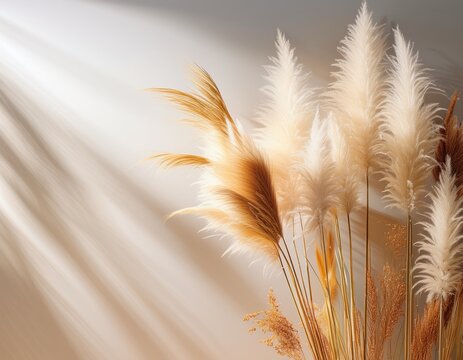 beige pampas grass and reeds create a charming natural scene against a simple neutral backdrop with sunlit wall reflections