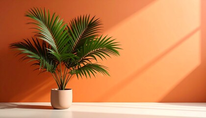 Palm plant in terracotta pot, sunlit room