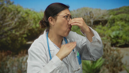 Asian muslim woman leans to inspect a vibrant shrub in a sunlit garden, embodying gardening.